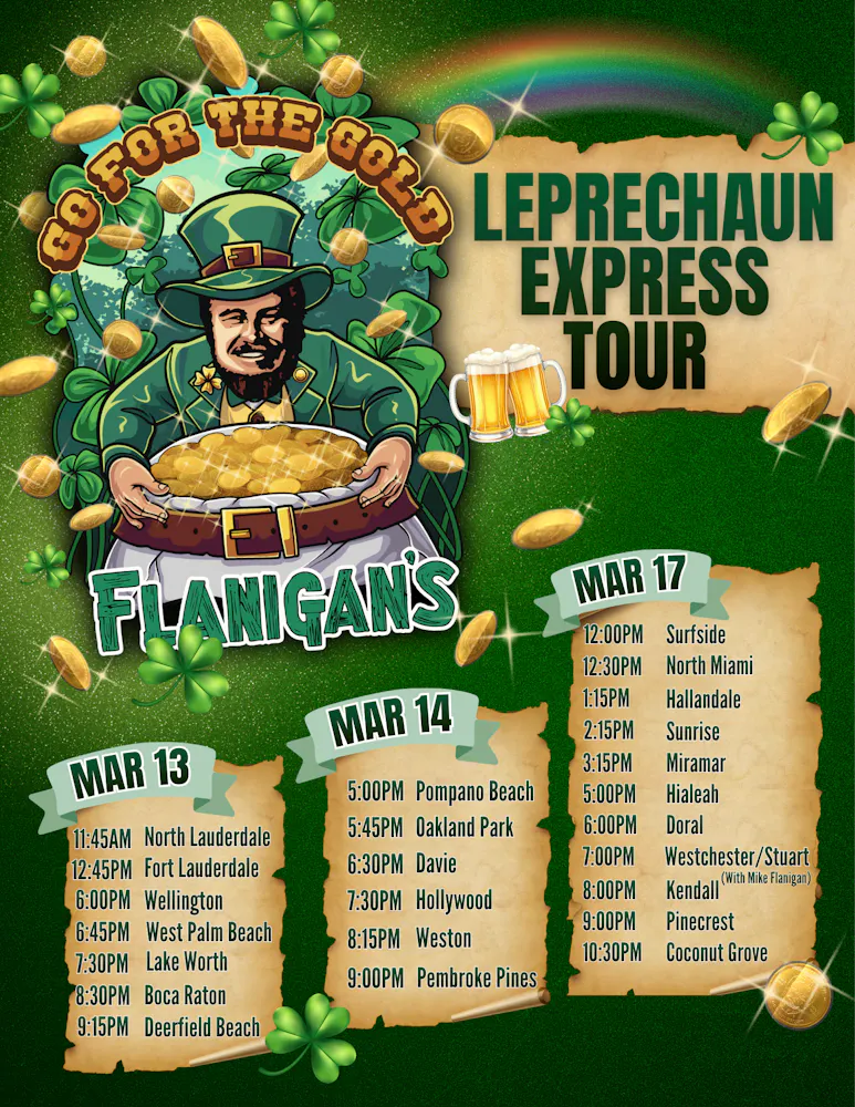 GET READY FOR SOME MAJOR GIVEAWAYS WHEN THE LEPRECHAUN EXPRESS COMES TO YOUR FLANIGAN'S!
