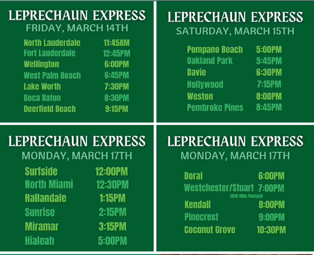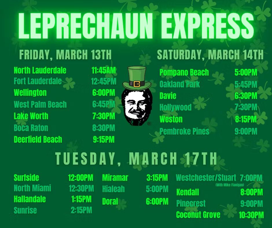 GET READY FOR SOME MAJOR GIVEAWAYS WHEN THE LEPRECHAUN EXPRESS COMES TO YOUR FLANIGAN'S!